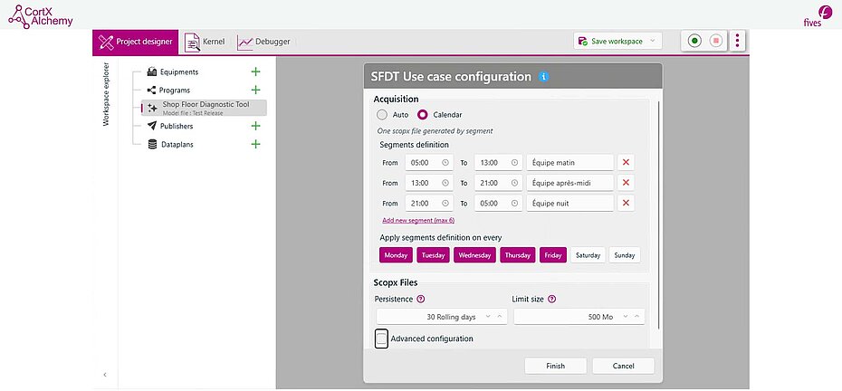 - Acquisition Calendar module: definition of recording periods and automatic splitting of scopx files [SW1] within a production day, for more detailed organization of the data collected.
